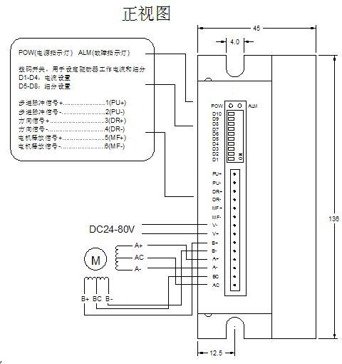 注:可根據(jù)客戶要求定制細分數(shù)! !注意 1、輸入電壓不能超過DC80V; 2、輸入控制信號電平為5V,當高于5V時需要接限流電阻; 3、輸入脈沖信號下降沿有效; 4、驅(qū)動器溫度超過80度時驅(qū)動器停止工作,故障指示燈ALM亮,直到驅(qū)動器溫度降到50度時,驅(qū)動器需要重新上電才能恢復(fù)工作。出現(xiàn)過熱保護請加裝散熱器; 5、過流(負載短路)故障指示燈ALM亮,請檢查電機接線及其他短路故障,排除后需要重新上電恢復(fù); 6、無電機故障指示燈ALM亮,請檢查電機接線,排除后需要重新上電恢復(fù)。 驅(qū)動器接線、尺寸示意圖