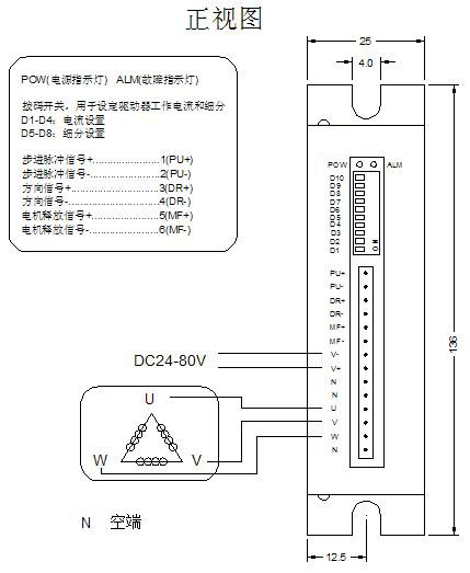 注:可根據(jù)客戶要求定制細(xì)分?jǐn)?shù)! !注意 1、輸入電壓不能超過DC50V; 2、輸入控制信號電平為5V,當(dāng)高于5V時需要接限流電阻; 3、輸入脈沖信號下降沿有效; 4、驅(qū)動器溫度超過80度時驅(qū)動器停止工作,故障指示燈ALM亮,直到驅(qū)動器溫度降到50度時,驅(qū)動器需要重新上電才能恢復(fù)工作。出現(xiàn)過熱保護(hù)請加裝散熱器; 5、過流(負(fù)載短路)故障指示燈ALM亮,請檢查電機(jī)接線及其他短路故障,排除后需要重新上電恢復(fù); 6、無電機(jī)故障指示燈ALM亮,請檢查電機(jī)接線,排除后需要重新上電恢復(fù)。
